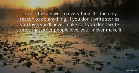 Bradbury, Ray. "Love is the answer to everything. It's the only reason to do anything. If you don't write stories you love, you'll never make it. If you don't write stories that other people love, you'll never make it." FixQuotes. January 15, 2026. https://fixquotes.com/quotes/love-is-the-answer-to-everything-its-the-only-163746/.