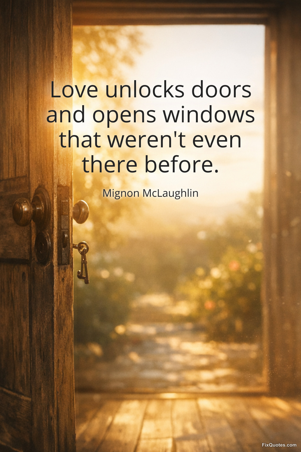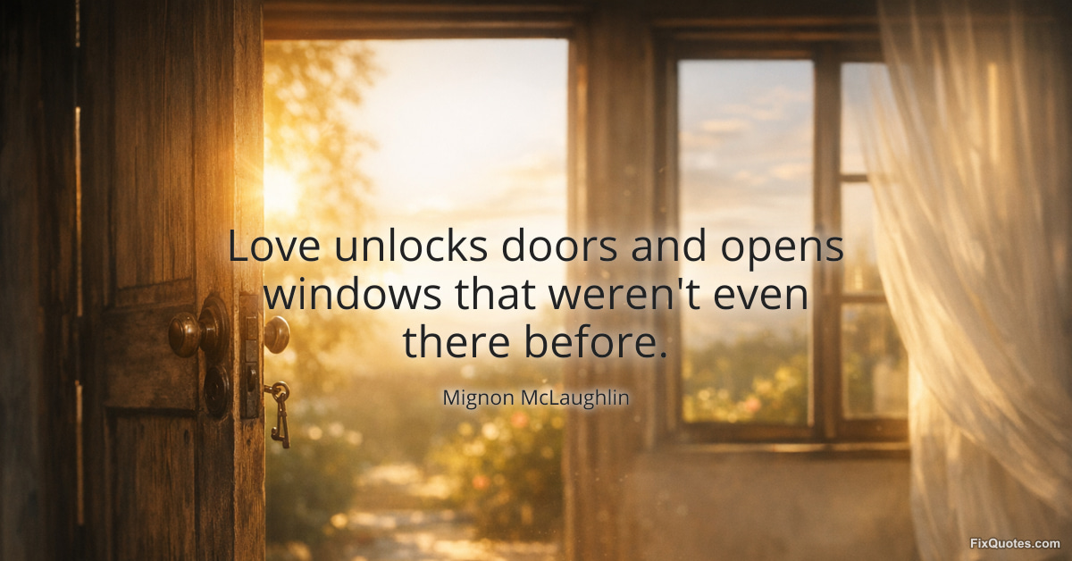 McLaughlin, Mignon. "Love unlocks doors and opens windows that weren't even there before." FixQuotes. February 18, 2026. https://fixquotes.com/quotes/love-unlocks-doors-and-opens-windows-that-werent-71497/.