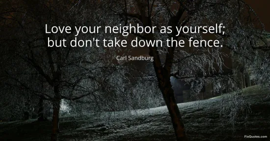 Sandburg, Carl. "Love your neighbor as yourself; but don't take down the fence." FixQuotes. January 17, 2026. https://fixquotes.com/quotes/love-your-neighbor-as-yourself-but-dont-take-down-64291/.
