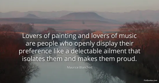 Blanchot, Maurice. (2026, January 15). Lovers of painting and lovers of music are people who openly display their preference like a delectable ailment that isolates them and makes them proud. FixQuotes. https://fixquotes.com/quotes/lovers-of-painting-and-lovers-of-music-are-people-169593/