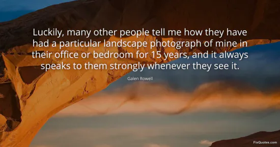 Rowell, Galen. (2026, February 20). Luckily, many other people tell me how they have had a particular landscape photograph of mine in their office or bedroom for 15 years, and it always speaks to them strongly whenever they see it. FixQuotes. https://fixquotes.com/quotes/luckily-many-other-people-tell-me-how-they-have-4003/