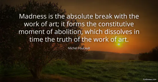 Foucault, Michel. (2026, January 18). Madness is the absolute break with the work of art; it forms the constitutive moment of abolition, which dissolves in time the truth of the work of art. FixQuotes. https://fixquotes.com/quotes/madness-is-the-absolute-break-with-the-work-of-3507/