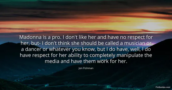 Fishman, Jon. "Madonna is a pro. I don't like her and have no respect for her, but- I don't think she should be called a musician or a dancer or whatever you know, but I do have, well, I do have respect for her ability to completely manipulate the media and have them work for her." FixQuotes. February 18, 2026. https://fixquotes.com/quotes/madonna-is-a-pro-i-dont-like-her-and-have-no-80448/.