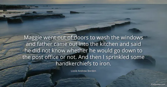 Borden, Lizzie Andrew. "Maggie went out of doors to wash the windows and father came out into the kitchen and said he did not know whether he would go down to the post office or not. And then I sprinkled some handkerchiefs to iron." FixQuotes. January 16, 2026. https://fixquotes.com/quotes/maggie-went-out-of-doors-to-wash-the-windows-and-99246/.