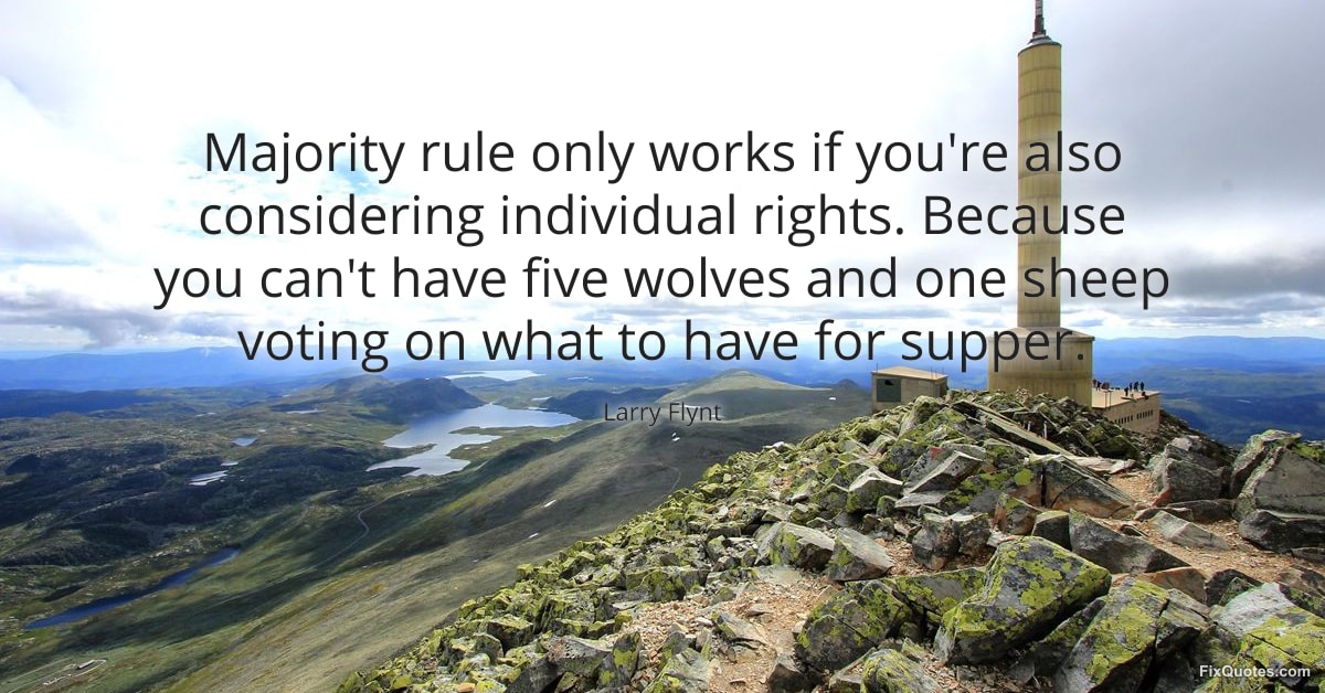 Flynt, Larry. (2026, January 18). Majority rule only works if you're also considering individual rights. Because you can't have five wolves and one sheep voting on what to have for supper. FixQuotes. https://fixquotes.com/quotes/majority-rule-only-works-if-youre-also-8976/