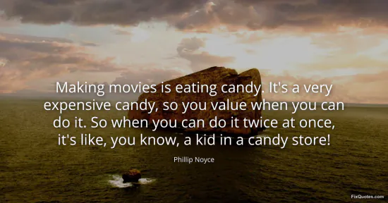 Noyce, Phillip. "Making movies is eating candy. It's a very expensive candy, so you value when you can do it. So when you can do it twice at once, it's like, you know, a kid in a candy store!" FixQuotes. January 15, 2026. https://fixquotes.com/quotes/making-movies-is-eating-candy-its-a-very-168291/.