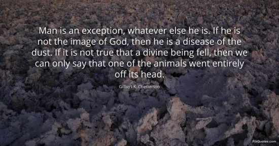 Chesterton, Gilbert K. "Man is an exception, whatever else he is. If he is not the image of God, then he is a disease of the dust. If it is not true that a divine being fell, then we can only say that one of the animals went entirely off its head." FixQuotes. January 15, 2026. https://fixquotes.com/quotes/man-is-an-exception-whatever-else-he-is-if-he-is-7386/.