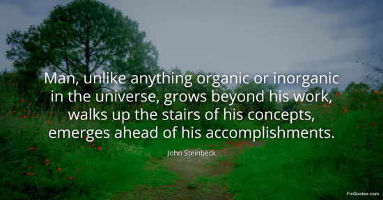Steinbeck, John. "Man, unlike anything organic or inorganic in the universe, grows beyond his work, walks up the stairs of his concepts, emerges ahead of his accomplishments." FixQuotes. January 17, 2026. https://fixquotes.com/quotes/man-unlike-anything-organic-or-inorganic-in-the-28815/.
