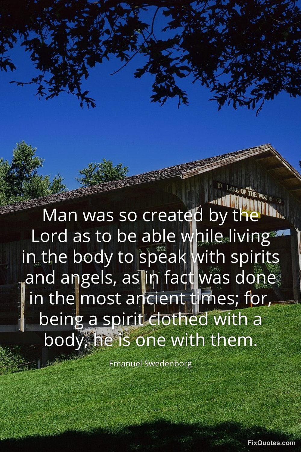 Swedenborg, Emanuel. "Man was so created by the Lord as to be able while living in the body to speak with spirits and angels, as in fact was done in the most ancient times; for, being a spirit clothed with a body, he is one with them." FixQuotes. January 17, 2026. https://fixquotes.com/quotes/man-was-so-created-by-the-lord-as-to-be-able-77082/.