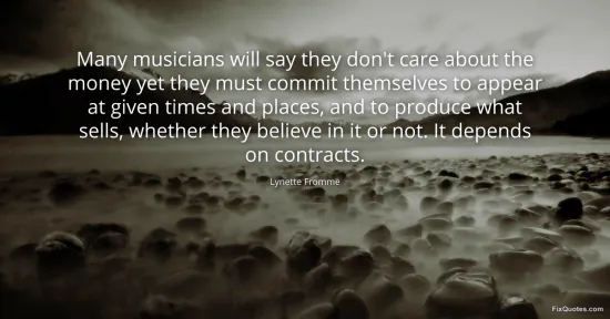 Fromme, Lynette. "Many musicians will say they don't care about the money yet they must commit themselves to appear at given times and places, and to produce what sells, whether they believe in it or not. It depends on contracts." FixQuotes. January 17, 2026. https://fixquotes.com/quotes/many-musicians-will-say-they-dont-care-about-the-81944/.