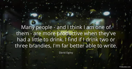 Ogilvy, David. (2026, January 18). Many people - and I think I am one of them - are more productive when they've had a little to drink. I find if I drink two or three brandies, I'm far better able to write. FixQuotes. https://fixquotes.com/quotes/many-people-and-i-think-i-am-one-of-them-are-6329/
