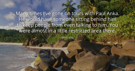 King, Ben E. "Many times I've gone on tours with Paul Anka. He would have someone sitting behind him to keep people from even talking to him. You were almost in a little restricted area there." FixQuotes. January 15, 2026. https://fixquotes.com/quotes/many-times-ive-gone-on-tours-with-paul-anka-he-39986/.
