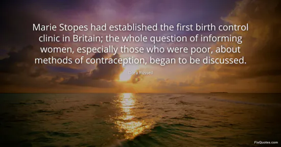 Russell, Dora. "Marie Stopes had established the first birth control clinic in Britain; the whole question of informing women, especially those who were poor, about methods of contraception, began to be discussed." FixQuotes. January 17, 2026. https://fixquotes.com/quotes/marie-stopes-had-established-the-first-birth-57911/.
