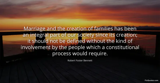 Bennett, Robert Foster. "Marriage and the creation of families has been an integral part of our society since its creation; it should not be defined without the kind of involvement by the people which a constitutional process would require." FixQuotes. January 17, 2026. https://fixquotes.com/quotes/marriage-and-the-creation-of-families-has-been-an-81381/.