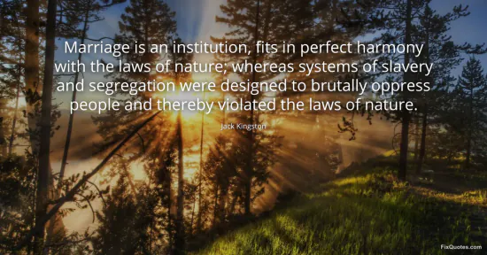 Kingston, Jack. (2026, February 18). Marriage is an institution, fits in perfect harmony with the laws of nature; whereas systems of slavery and segregation were designed to brutally oppress people and thereby violated the laws of nature. FixQuotes. https://fixquotes.com/quotes/marriage-is-an-institution-fits-in-perfect-95260/