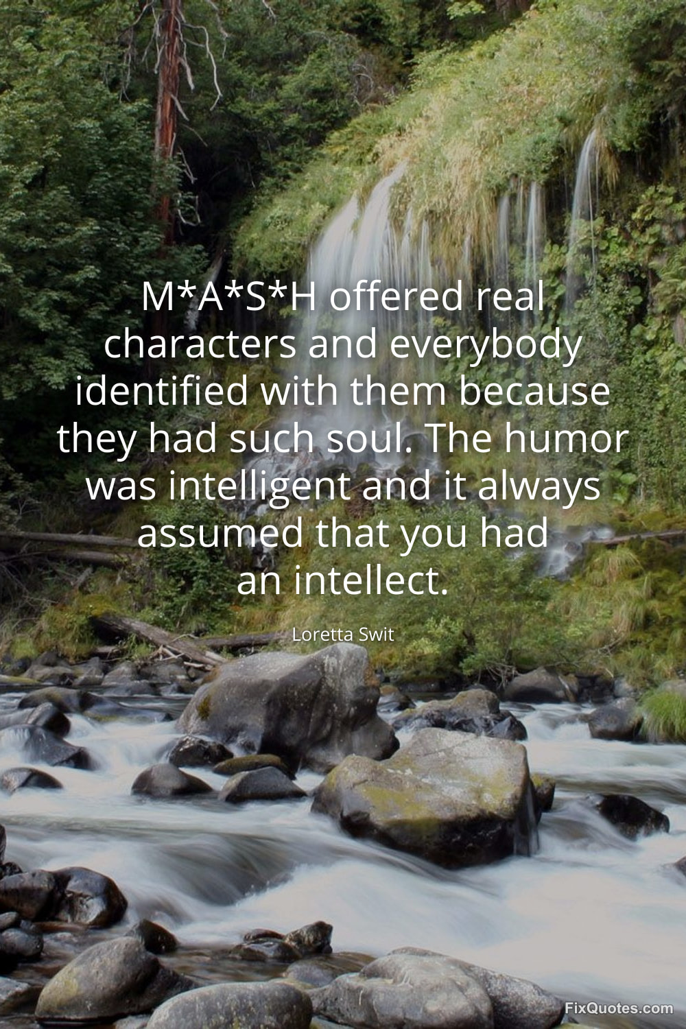 Swit, Loretta. "M*A*S*H offered real characters and everybody identified with them because they had such soul. The humor was intelligent and it always assumed that you had an intellect." FixQuotes. January 16, 2026. https://fixquotes.com/quotes/mash-offered-real-characters-and-everybody-127170/.