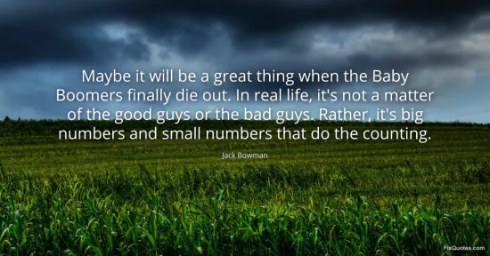 Bowman, Jack. (2026, January 17). Maybe it will be a great thing when the Baby Boomers finally die out. In real life, it's not a matter of the good guys or the bad guys. Rather, it's big numbers and small numbers that do the counting. FixQuotes. https://fixquotes.com/quotes/maybe-it-will-be-a-great-thing-when-the-baby-61701/