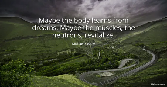 "Maybe the body learns from dreams. Maybe the muscles, the neutrons, revitalize." FixQuotes, 16 Jan. 2026, https://fixquotes.com/quotes/maybe-the-body-learns-from-dreams-maybe-the-127774/. Accessed 12 Feb. 2026.