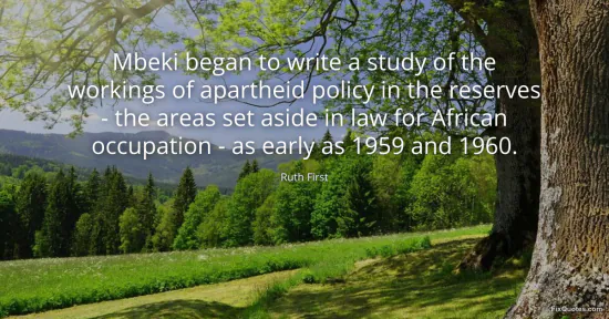 First, Ruth. "Mbeki began to write a study of the workings of apartheid policy in the reserves - the areas set aside in law for African occupation - as early as 1959 and 1960." FixQuotes. January 16, 2026. https://fixquotes.com/quotes/mbeki-began-to-write-a-study-of-the-workings-of-115934/.