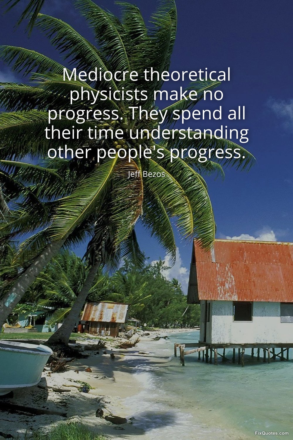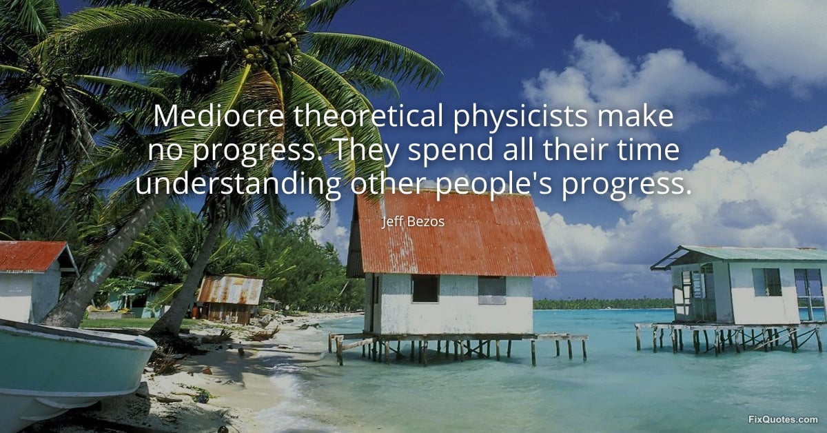 Bezos, Jeff. (2026, March 25). Mediocre theoretical physicists make no progress. They spend all their time understanding other people's progress. FixQuotes. https://fixquotes.com/quotes/mediocre-theoretical-physicists-make-no-progress-186404/