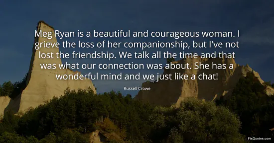Crowe, Russell. "Meg Ryan is a beautiful and courageous woman. I grieve the loss of her companionship, but I've not lost the friendship. We talk all the time and that was what our connection was about. She has a wonderful mind and we just like a chat!" FixQuotes. February 18, 2026. https://fixquotes.com/quotes/meg-ryan-is-a-beautiful-and-courageous-woman-i-73597/.