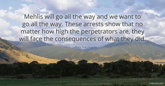 Hariri, Rafic. (2026, January 16). Mehlis will go all the way and we want to go all the way. These arrests show that no matter how high the perpetrators are, they will face the consequences of what they did. FixQuotes. https://fixquotes.com/quotes/mehlis-will-go-all-the-way-and-we-want-to-go-all-105157/