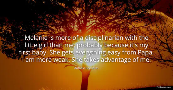 Banderas, Antonio. (2026, January 16). Melanie is more of a disciplinarian with the little girl than me, probably because it's my first baby. She gets everything easy from Papa. I am more weak. She takes advantage of me. FixQuotes. https://fixquotes.com/quotes/melanie-is-more-of-a-disciplinarian-with-the-121172/