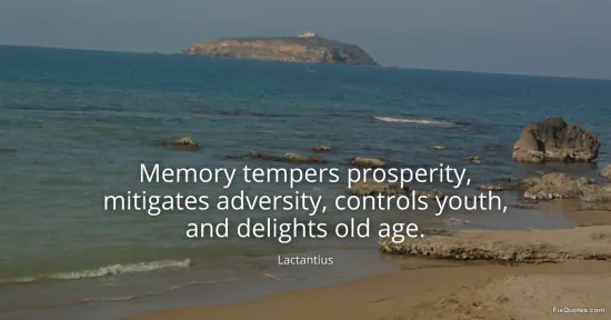 Lactantius. "Memory tempers prosperity, mitigates adversity, controls youth, and delights old age." FixQuotes. January 15, 2026. https://fixquotes.com/quotes/memory-tempers-prosperity-mitigates-adversity-153717/.