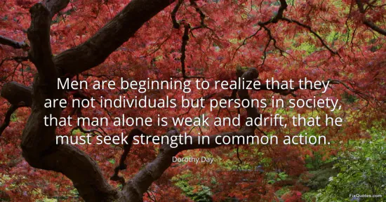 Day, Dorothy. "Men are beginning to realize that they are not individuals but persons in society, that man alone is weak and adrift, that he must seek strength in common action." FixQuotes. January 17, 2026. https://fixquotes.com/quotes/men-are-beginning-to-realize-that-they-are-not-59260/.