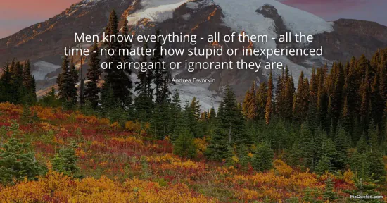 Dworkin, Andrea. (2026, January 15). Men know everything - all of them - all the time - no matter how stupid or inexperienced or arrogant or ignorant they are. FixQuotes. https://fixquotes.com/quotes/men-know-everything-all-of-them-all-the-time-38761/