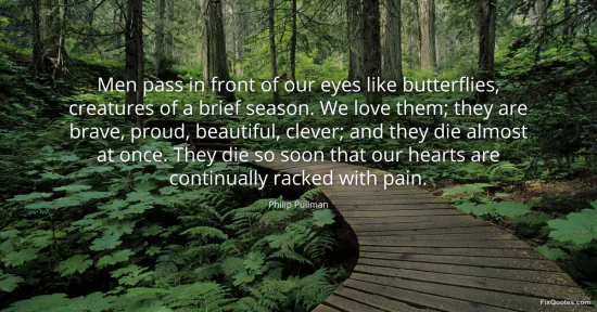 Pullman, Philip. (2026, January 18). Men pass in front of our eyes like butterflies, creatures of a brief season. We love them; they are brave, proud, beautiful, clever; and they die almost at once. They die so soon that our hearts are continually racked with pain. FixQuotes. https://fixquotes.com/quotes/men-pass-in-front-of-our-eyes-like-butterflies-7592/