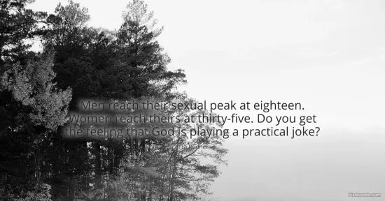 "Men reach their sexual peak at eighteen. Women reach theirs at thirty-five. Do you get the feeling that God is playing a practical joke?" FixQuotes, 15 Jan. 2026, https://fixquotes.com/quotes/men-reach-their-sexual-peak-at-eighteen-women-159359/. Accessed 25 Feb. 2026.