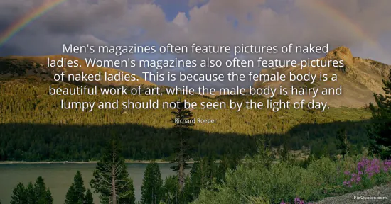 Roeper, Richard. (2026, January 15). Men's magazines often feature pictures of naked ladies. Women's magazines also often feature pictures of naked ladies. This is because the female body is a beautiful work of art, while the male body is hairy and lumpy and should not be seen by the light of day. FixQuotes. https://fixquotes.com/quotes/mens-magazines-often-feature-pictures-of-naked-79477/