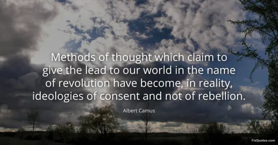 "Methods of thought which claim to give the lead to our world in the name of revolution have become, in reality, ideologies of consent and not of rebellion." FixQuotes, 15 Jan. 2026, https://fixquotes.com/quotes/methods-of-thought-which-claim-to-give-the-lead-34968/. Accessed 12 Feb. 2026.