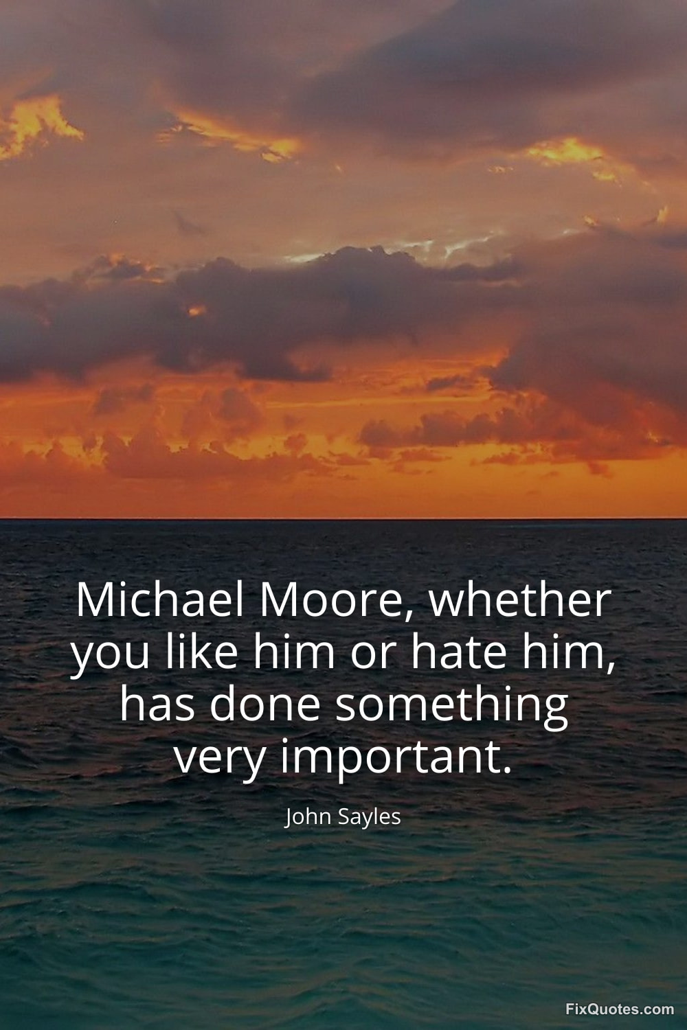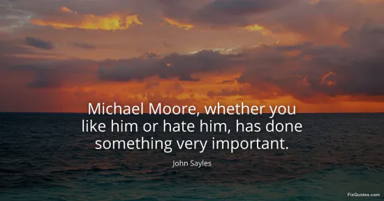 Sayles, John. "Michael Moore, whether you like him or hate him, has done something very important." FixQuotes. January 17, 2026. https://fixquotes.com/quotes/michael-moore-whether-you-like-him-or-hate-him-61026/.