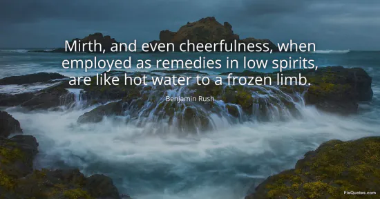 Rush, Benjamin. "Mirth, and even cheerfulness, when employed as remedies in low spirits, are like hot water to a frozen limb." FixQuotes. January 16, 2026. https://fixquotes.com/quotes/mirth-and-even-cheerfulness-when-employed-as-114374/.