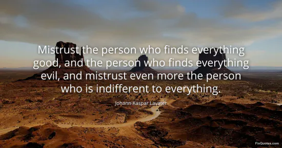 Lavater, Johann Kaspar. "Mistrust the person who finds everything good, and the person who finds everything evil, and mistrust even more the person who is indifferent to everything." FixQuotes. January 18, 2026. https://fixquotes.com/quotes/mistrust-the-person-who-finds-everything-good-and-22693/.