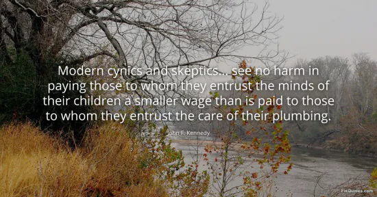 Kennedy, John F. (2026, January 17). Modern cynics and skeptics... see no harm in paying those to whom they entrust the minds of their children a smaller wage than is paid to those to whom they entrust the care of their plumbing. FixQuotes. https://fixquotes.com/quotes/modern-cynics-and-skeptics-see-no-harm-in-paying-25930/