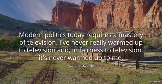 Mondale, Walter F. (2026, January 15). Modern politics today requires a mastery of television. I've never really warmed up to television and, in fairness to television, it's never warmed up to me. FixQuotes. https://fixquotes.com/quotes/modern-politics-today-requires-a-mastery-of-156961/