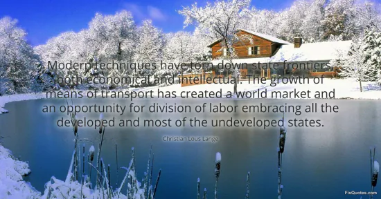 Lange, Christian Lous. (2026, January 17). Modern techniques have torn down state frontiers, both economical and intellectual. The growth of means of transport has created a world market and an opportunity for division of labor embracing all the developed and most of the undeveloped states. FixQuotes. https://fixquotes.com/quotes/modern-techniques-have-torn-down-state-frontiers-32725/