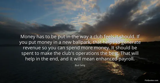 Selig, Bud. (2026, January 17). Money has to be put in the way a club feels it should. If you put money in a new ballpark, that helps to generate revenue so you can spend more money. It should be spent to make the club's operations the best. That will help in the end, and it will mean enhanced payroll. FixQuotes. https://fixquotes.com/quotes/money-has-to-be-put-in-the-way-a-club-feels-it-47002/