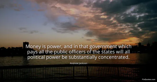 Jackson, Andrew. (2026, January 15). Money is power, and in that government which pays all the public officers of the states will all political power be substantially concentrated. FixQuotes. https://fixquotes.com/quotes/money-is-power-and-in-that-government-which-pays-3796/