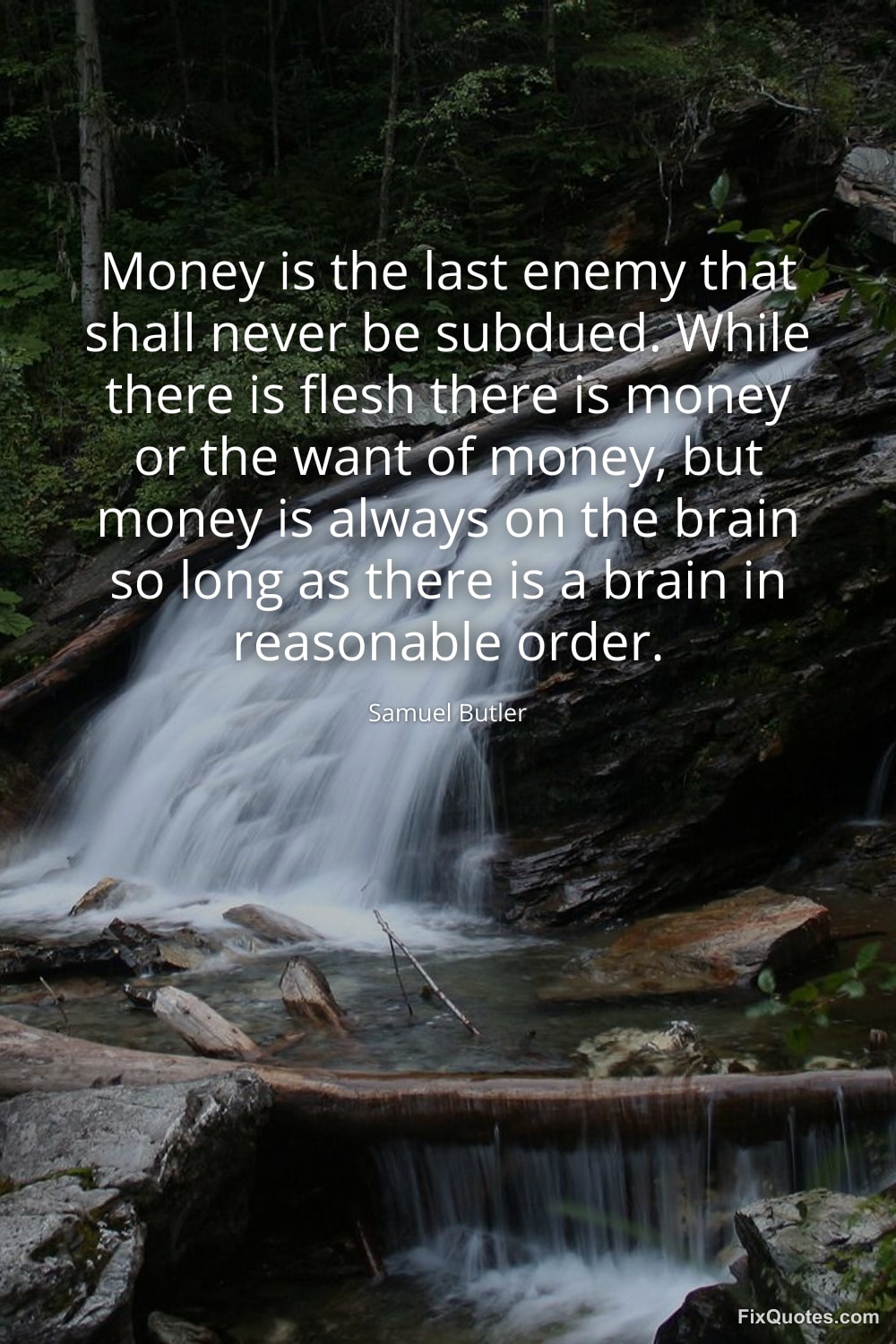 Butler, Samuel. (2026, January 18). Money is the last enemy that shall never be subdued. While there is flesh there is money or the want of money, but money is always on the brain so long as there is a brain in reasonable order. FixQuotes. https://fixquotes.com/quotes/money-is-the-last-enemy-that-shall-never-be-18151/