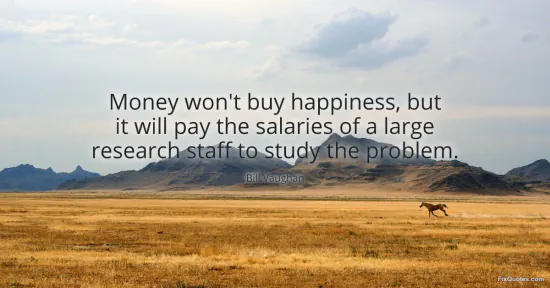 Vaughan, Bill. "Money won't buy happiness, but it will pay the salaries of a large research staff to study the problem." FixQuotes. January 17, 2026. https://fixquotes.com/quotes/money-wont-buy-happiness-but-it-will-pay-the-39165/.