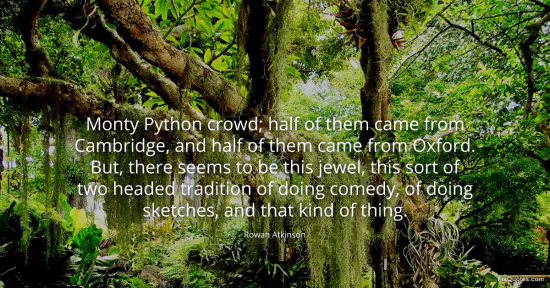 Atkinson, Rowan. (2026, January 15). Monty Python crowd; half of them came from Cambridge, and half of them came from Oxford. But, there seems to be this jewel, this sort of two headed tradition of doing comedy, of doing sketches, and that kind of thing. FixQuotes. https://fixquotes.com/quotes/monty-python-crowd-half-of-them-came-from-4819/