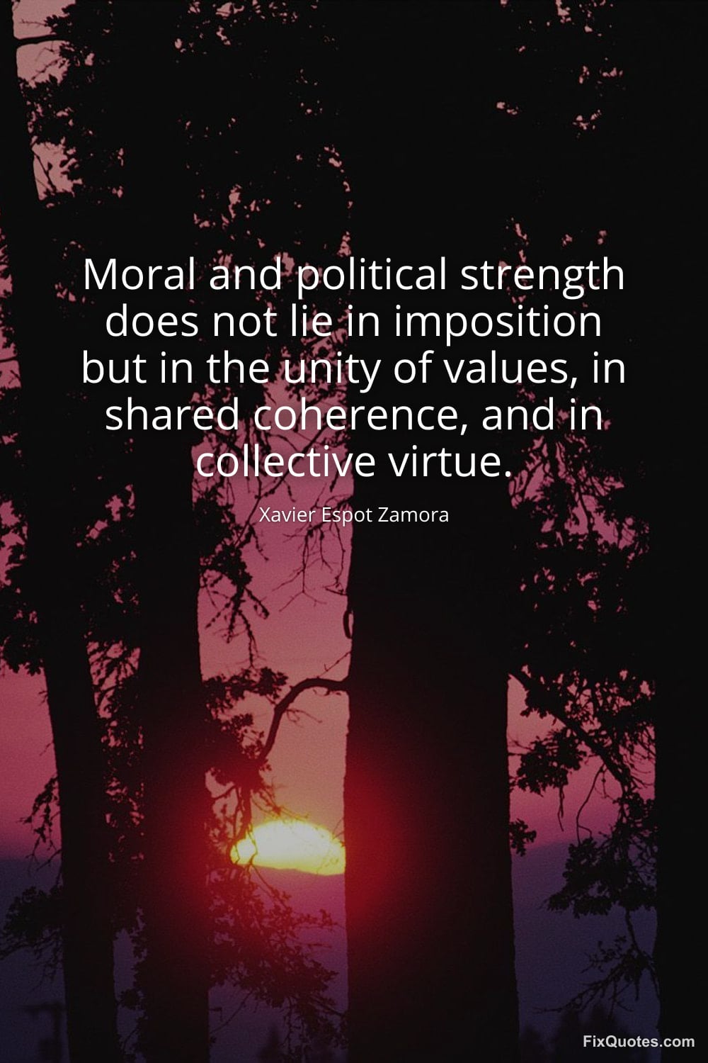 Zamora, Xavier Espot. (2026, February 15). Moral and political strength does not lie in imposition but in the unity of values, in shared coherence, and in collective virtue. FixQuotes. https://fixquotes.com/quotes/moral-and-political-strength-does-not-lie-in-185347/