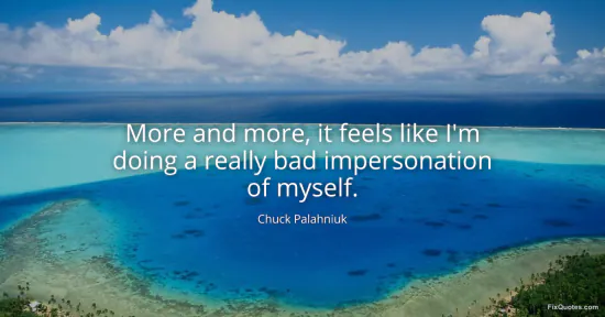 Palahniuk, Chuck. "More and more, it feels like I'm doing a really bad impersonation of myself." FixQuotes. January 15, 2026. https://fixquotes.com/quotes/more-and-more-it-feels-like-im-doing-a-really-bad-23082/.