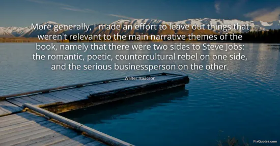 "More generally, I made an effort to leave out things that weren't relevant to the main narrative themes of the book, namely that there were two sides to Steve Jobs: the romantic, poetic, countercultural rebel on one side, and the serious businessperson on the other." FixQuotes, 15 Jan. 2026, https://fixquotes.com/quotes/more-generally-i-made-an-effort-to-leave-out-154977/. Accessed 12 Feb. 2026.