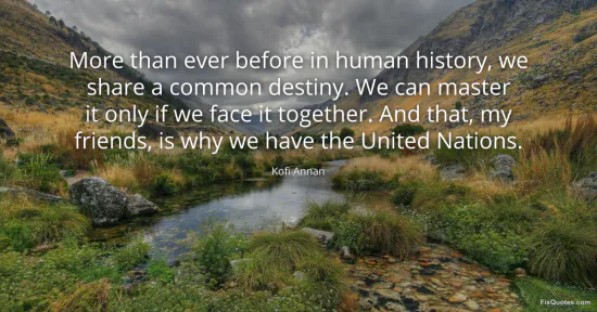 Annan, Kofi. (2026, January 17). More than ever before in human history, we share a common destiny. We can master it only if we face it together. And that, my friends, is why we have the United Nations. FixQuotes. https://fixquotes.com/quotes/more-than-ever-before-in-human-history-we-share-a-79106/