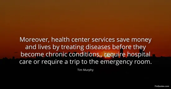 Murphy, Tim. (2026, February 18). Moreover, health center services save money and lives by treating diseases before they become chronic conditions,, require hospital care or require a trip to the emergency room. FixQuotes. https://fixquotes.com/quotes/moreover-health-center-services-save-money-and-78479/